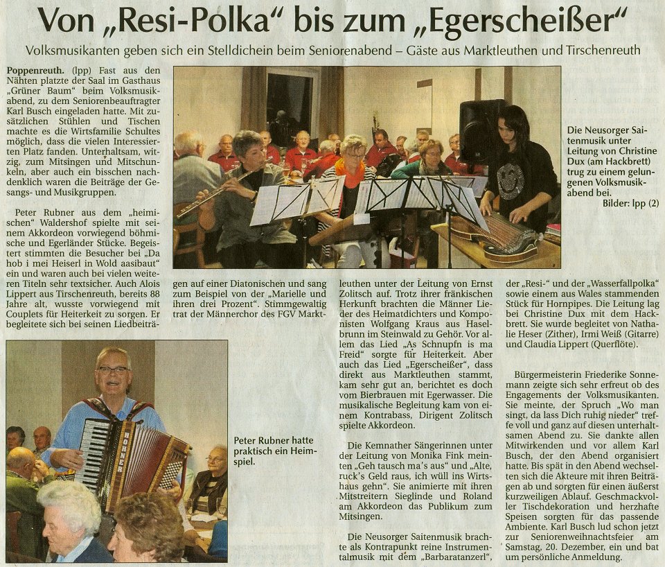 Der Kirchenchor unter der Leitung von Heidi Sprügel sang vom Geheimnis und dem Wunder um das "Kindlein im armen Stall", mit "Als ich bei meinen Schafen wacht" aus der Perspektive der Hirten und schloss die Weihnachtsgeschichte mit der leicht orientalisch klingenden Erzählung der "Könige aus Morgenland", die dem Kind verschiedene Gaben zur Krippe brachten. Der "Dreig’sang" mit Christian Peter Rothemund, Eva Sommerer und Anja Lohneisen hatte vier innige alpenländische Lieder im musikalischen Gepäck: "Rorate! Ach tauet Ihr Himmel herab", "Jetzt fangen wir zum Singen an", "Es wird scho glei dumpa" und den Andachtsjodler. Zur musikalischen Begleitung hatte sich Zitherkünstler Gerhard Wunderlich aus Kirchenlamitz dazugesellt, der mit einem Solostück für einen weiteren Höhepunkt der musikalischen Stunde sorgte. Mit dem Segen und einem prächtigen stimmgewaltigen "O du fröhliche" mit allen Mitwirkenden und Zuhörern ging dann Weihnachten in Marktleuthen wirklich zu Ende, die Lieder und Worte klingen vielleicht noch eine Weile nach.