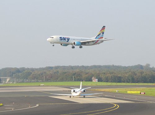 Hier ebenfalls ein Landeanflug, während eine weitere Maschine auf den Start wartet. |