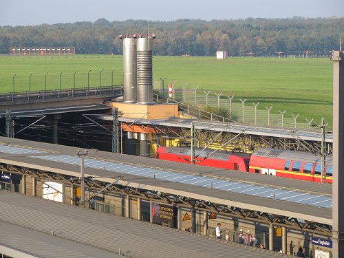 Der Bahnhof Düsseldorf Flughafen ist von der letzten Besucherterrasse aus gut einzusehen. Hier hält gerade ein doppelstöckiger Zug, der für Regionalbahnen und den Regionalexpress eingesetzt wird. |