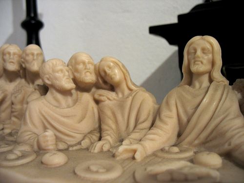 Eine kleine Marmor-Statue in der Sakristei unserer evangelischen Kirche in Marktleuthen, gestaltet nach Da Vincis berühmten Gemälde des Abendmahls: Jesus und seine Frau, vielleicht Maria Magdalena, oder ein Symbol für die Weiblichkeit Gottes? Widersprüche und Kuriositäten in der Menschheitsgeschichte und der Bibel!