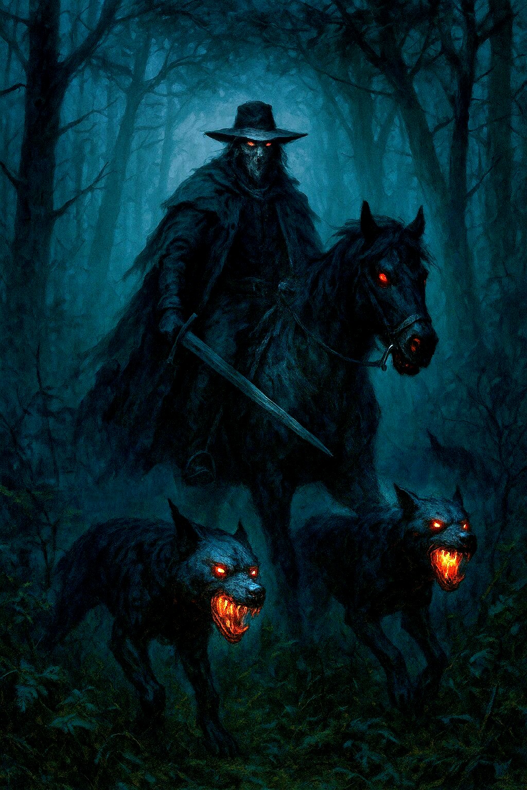 Der Nachtjäger trat das erste Mal in der Dämmerung hervor, als die letzten Sonnenstrahlen zwischen Kösseine und Ochsenkopf verschwanden, und das Licht in kalten Streifen blutrot über den Himmel strich. Er ritt nicht wie die Reiter der Welt, sein Ross hatte nur drei Beine. Die Hufe klangen wie Hammerhiebe auf dem Granit, und um seinen Hals hing eine Kette aus rostigem Eisen, an der kleine, zerschundene Glocken schwangen, deren Ton die Hunde scheuchte. Bei ihm zog das Butzenheer, Gestalten ohne Namen, Nebel in Menschengestalt, knirschend wie verrostetes Eisen, knisternd wie dürres Reisig.
